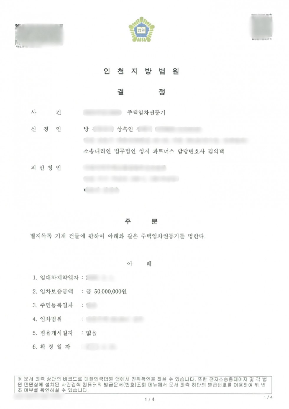 이에 본 대리인은 임대차계약서, 등기사항증명서 등 법적 필요 자료를 구비하여 관할 법원에 임차권등기명령신청서를 제출하였습니다. 이후 법원으로부터 보정 명령이 내려졌으나, 사실관계 조회를 통해 추가 자료를 보완하여 법원에 제출함으로써 절차를 완료하였습니다.