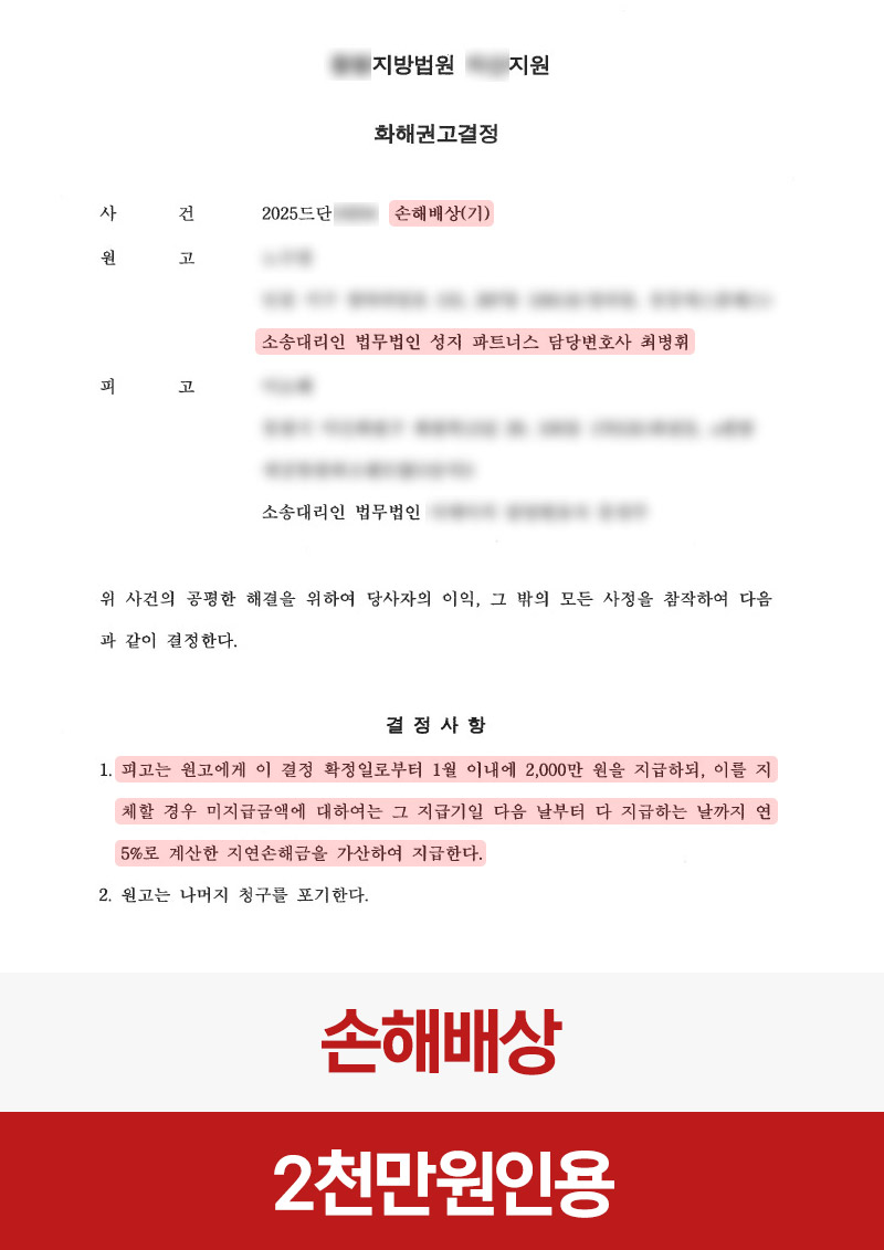 법원은 제출된 자료와 사실관계를 바탕으로 피고에게 상당한 책임이 있다고 판단했습니다. 그 결과 원고의 청구 취지를 반영한 2천만 원 지급 화해권고 결정이 내려졌습니다.