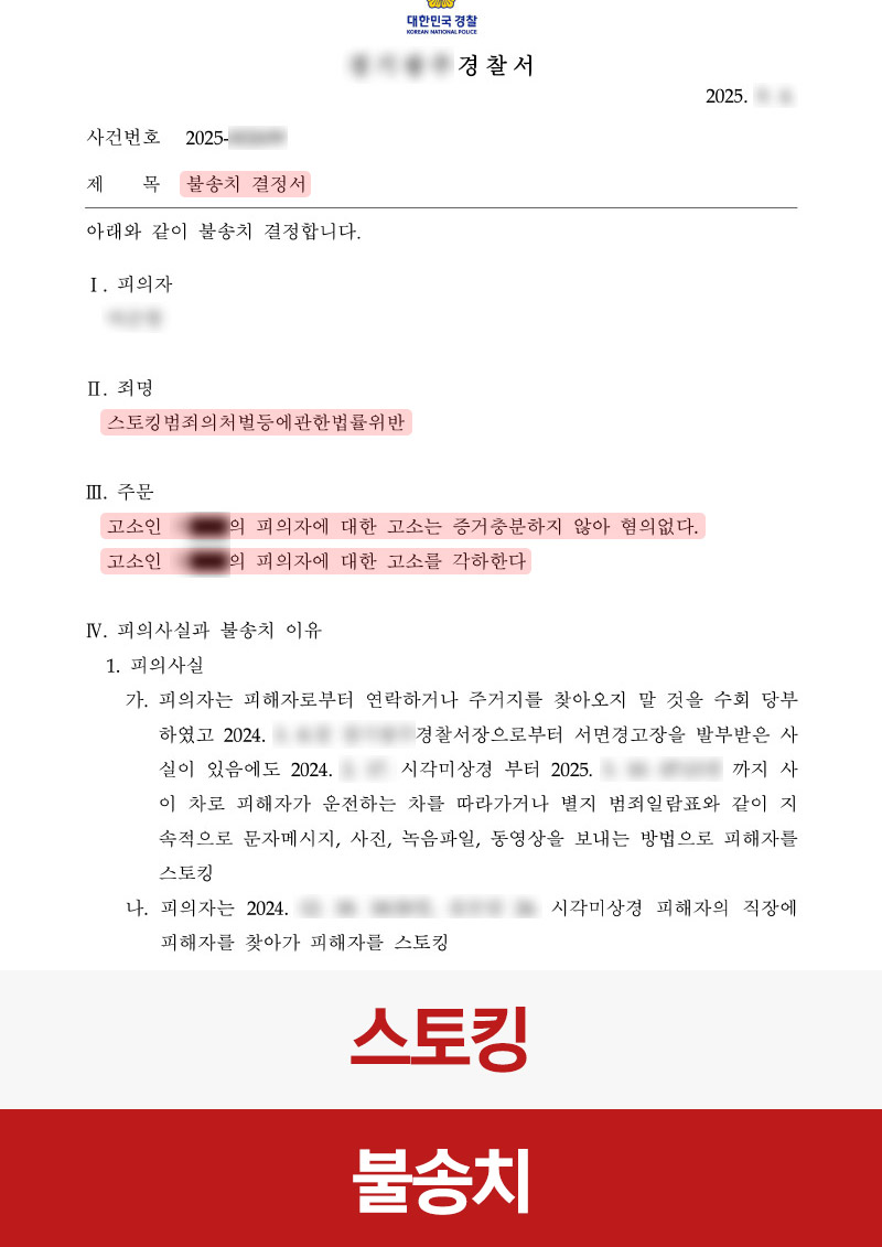 의뢰인의 초기 입장을 정확히 확인하고 피해자의 접근 금지 요청과 의뢰인의 대응 내역을 체계적으로 정리했습니다. 이를 바탕으로 수사기관에 객관적인 상황을 전달하고 불필요한 오해가 발생하지 않도록 관리했습니다. 또한 사건 진행 중 피해자와의 접촉을 최소화하도록 안내하여 추가 법적 문제를 예방하고 향후 유사 사건 발생 시 대응 방법과 증거 확보 전략까지 함께 준비했습니다.