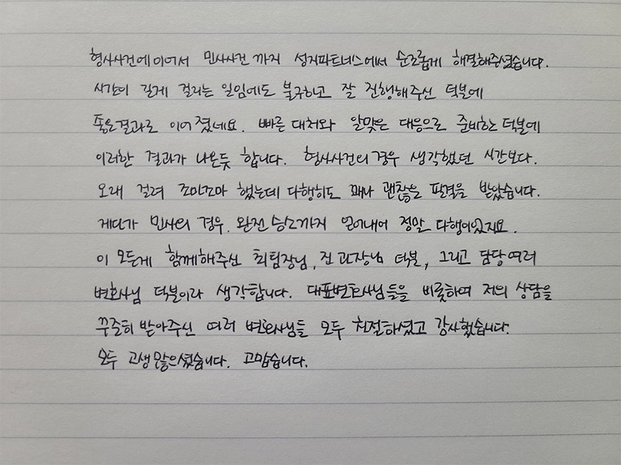 변호사님 덕분이라 생각합니다. 대표변호사님들을 비롯하여 저의 상담을