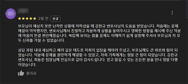 부모님이 예상치 못한 난처한 상황에 처하셨을 때 강천규 변호사님의 도움을 받았습니다.