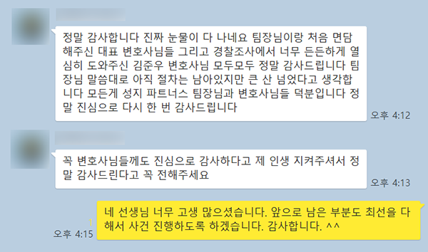 정말 감사합니다. 진짜 눈물이 다 나네요. 팀장님이랑 처음 면담해주신 대표 변호사님들 그리고 경찰조사에서 너무 든든하게 열심히 도와주신 김준우 변호사님 모두모두 정말 감사드립니다. 팀장님 말씀대로 아직 절차는 남아있지만 큰 산 넘었다고 생각합니다. 모든게 성지 파트너스 팀장님과 변호사님들 덕분입니다. 정말 진심으로 다시 한 번 감사드립니다.