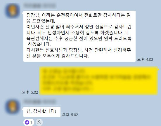 의뢰인 감사후기 본문 팀장님, 아까는 운전중이여서 전화로만 감사하다는 말씀 드렸었는데.이번사건 신경 많이 써주셔서 정말 진심으로 감사드립 니다. 저도 반성하면서 조용히 살도록 하겠습니다.교육관련해서는 추후 궁금한 점이 있으면 연락 드리도록 하겠습니다.다시한번 변호사님과 팀장님, 사건 관련해서 신경써주신 분들 모두에게 감사드립니다. 담당변호사 김준우변호사 처분 조건부 기소유예 유사건으로 빠른상담 필요 시 빠른상담 신청 상담신청 목록 이전글의뢰인 감사후기 26.01.20 다음글의뢰인 감사후기 26.01.15 SZP 미디어 MORE